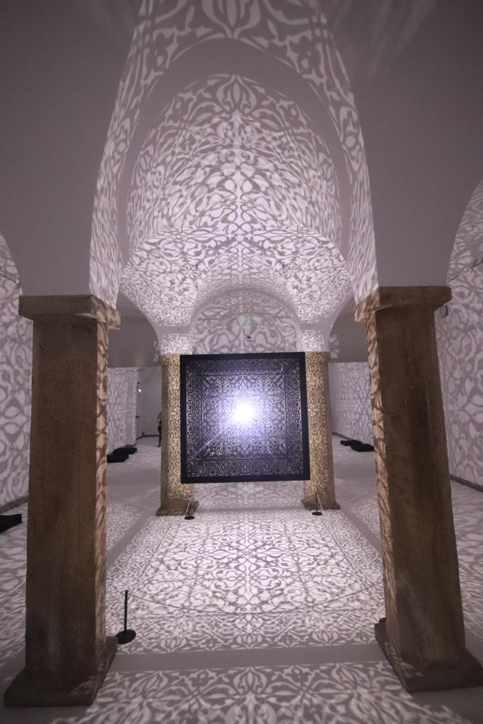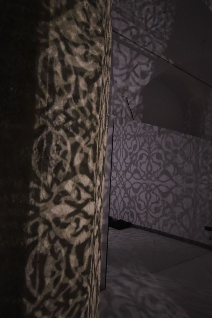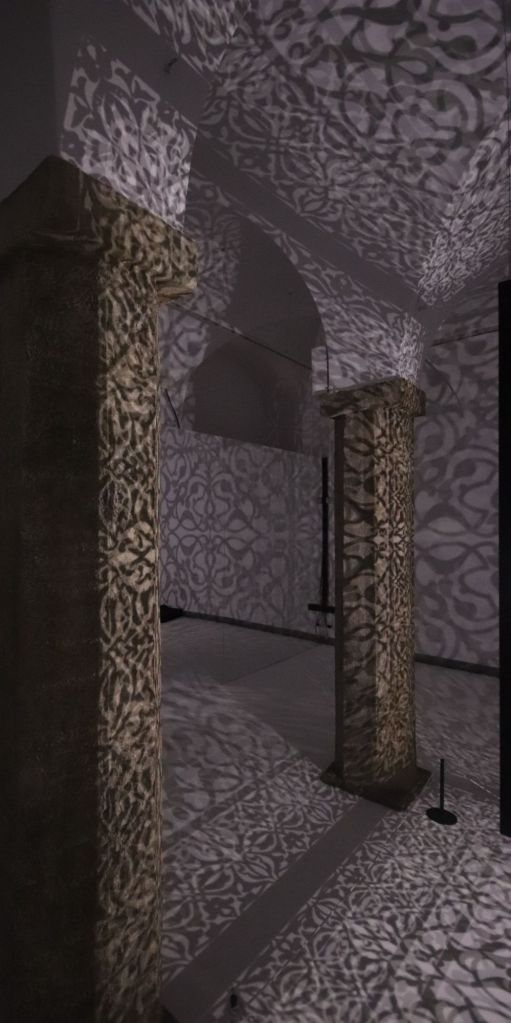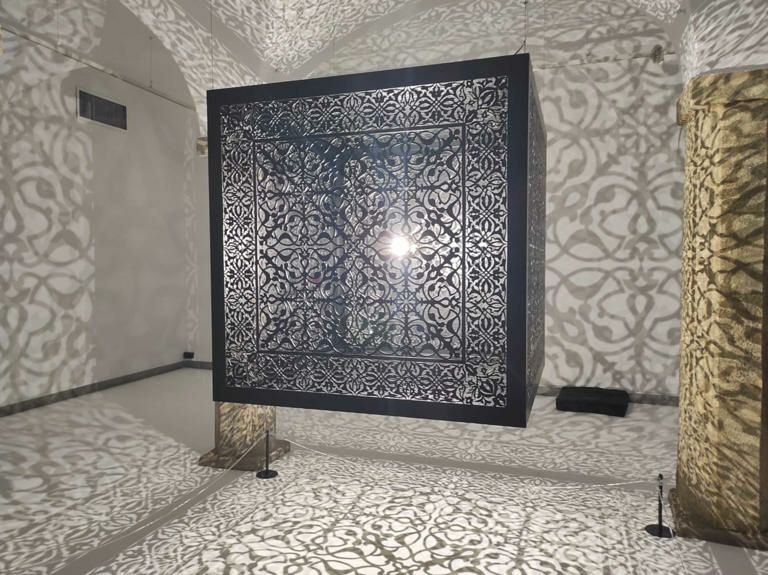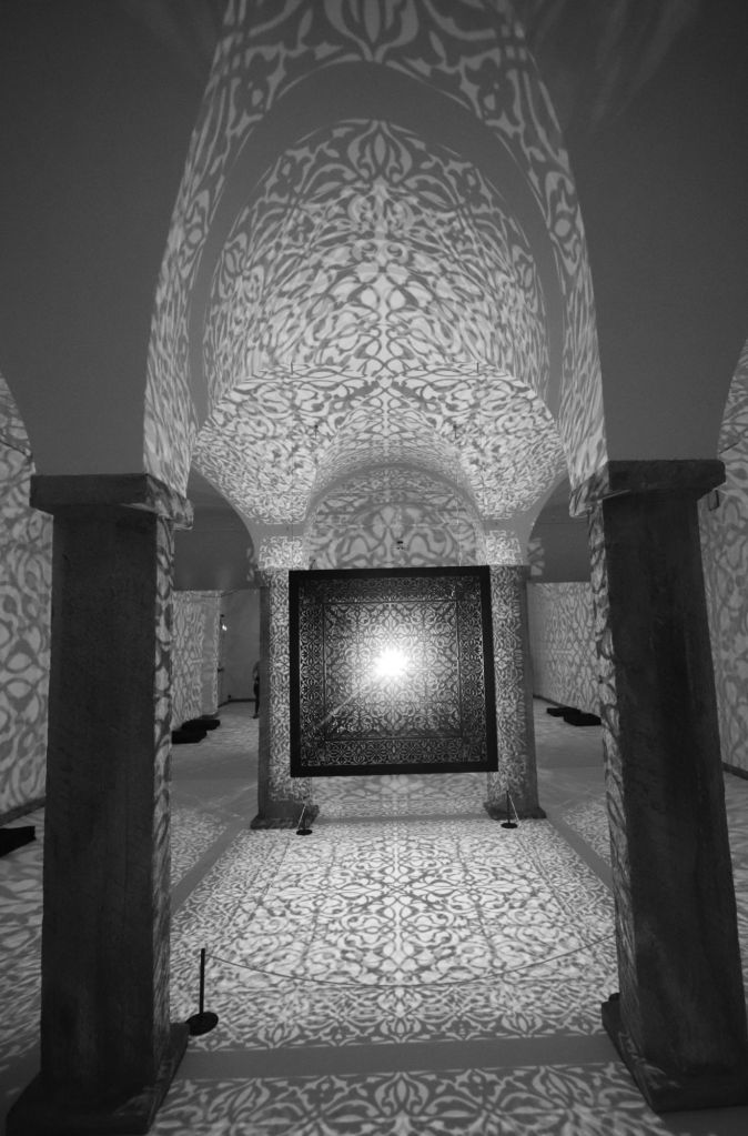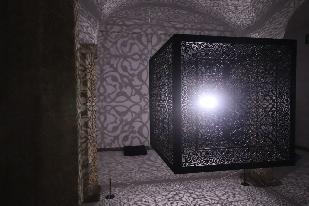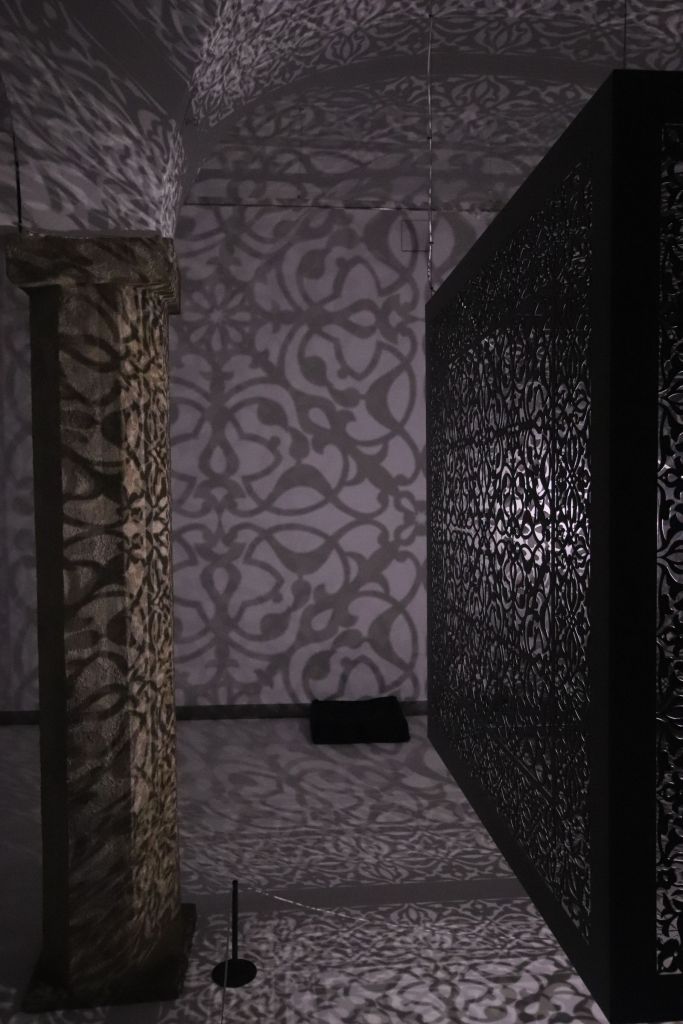 Il secondo regalo è l’installazione Shimmering Mirage (Black), del 2018, di Anila Quayyum Agha, artista pakistana-americana che con la sua scatola sospesa, finemente traforata e illuminata dall’interno, trasforma l’ambiente che la contiene e trasporta il visitatore in un luogo immaginario, un po’ cripta, un po’ moschea, un po’ Alhambra un po’ Aghia Sophia, un po’ Alamut, palazzo del Veglio della Montagna e degli Assassini.