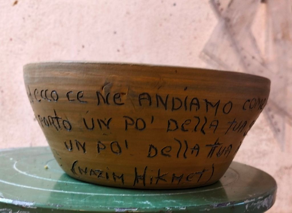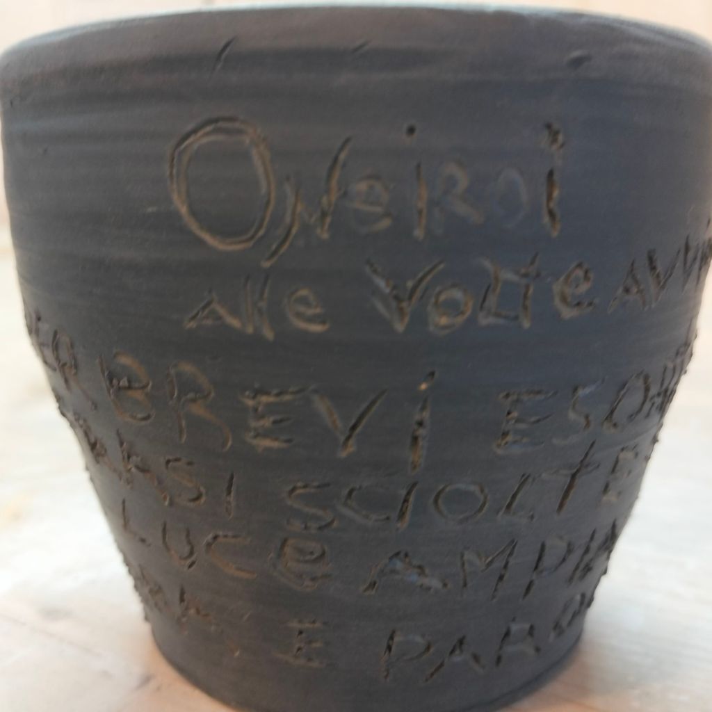 Il delitto insomma era già quasi servito e ho finito per consumarlo applicandomi alle realizzazioni del corso. Così mi è venuto naturale decidere di creare dei piccoli “vasi poetici” o vasi-poesia, dove non so cosa sia contenitore e cosa contenuto; ma so per certo che il senso di concentrazione e di tranquillità, il piacere creativo che ho provato mentre scrivevo incidendo con uno stilo il vasetto di argilla ancora morbido è stato davvero una scoperta, qualcosa che è andato ben oltre l’anima razionale e ha mobilitato altre parti di me, non so come e non so quali. Una vera sorpresa. Un nuovo viaggio.