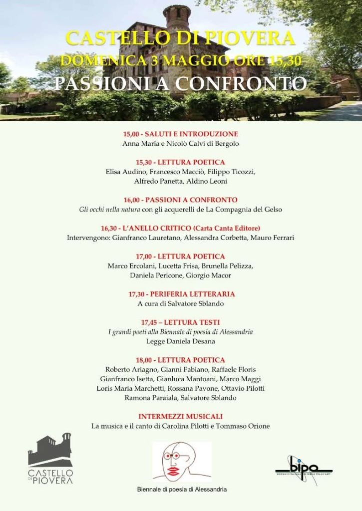 Sono grato di essere stato coinvolto attraverso Periferia Letteraria all’importante evento di domenica 3 maggio: PASSIONI A CONFRONTO. Un momento di confronto che la Biennale di poesia di Alessandria organizza da trenta anni presso il Castello di Piovera dove poeti e critici, si incontreranno  per dialogare fra loro e  con il pubblico, proponendo letture e riflessioni critiche. L’evento è inserito  nella Biennale italiana di poesia fra le arti, che si svolge interessando tre regioni (Piemonte, Emilia Romagna e Lombardia).